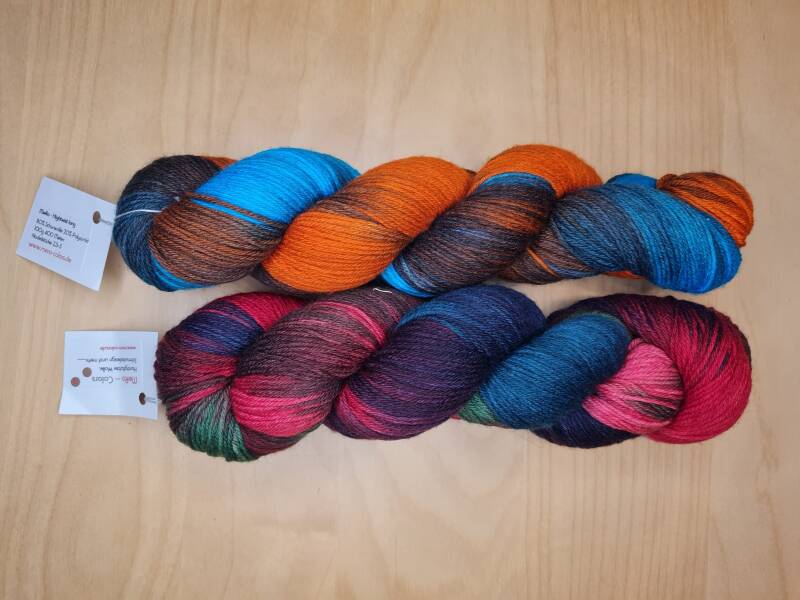 Hier habe ich zwei Merino Sockenwollstränge. Seht euch mal diese großartigen Farben an. Sind die nicht der Wahnsinn?